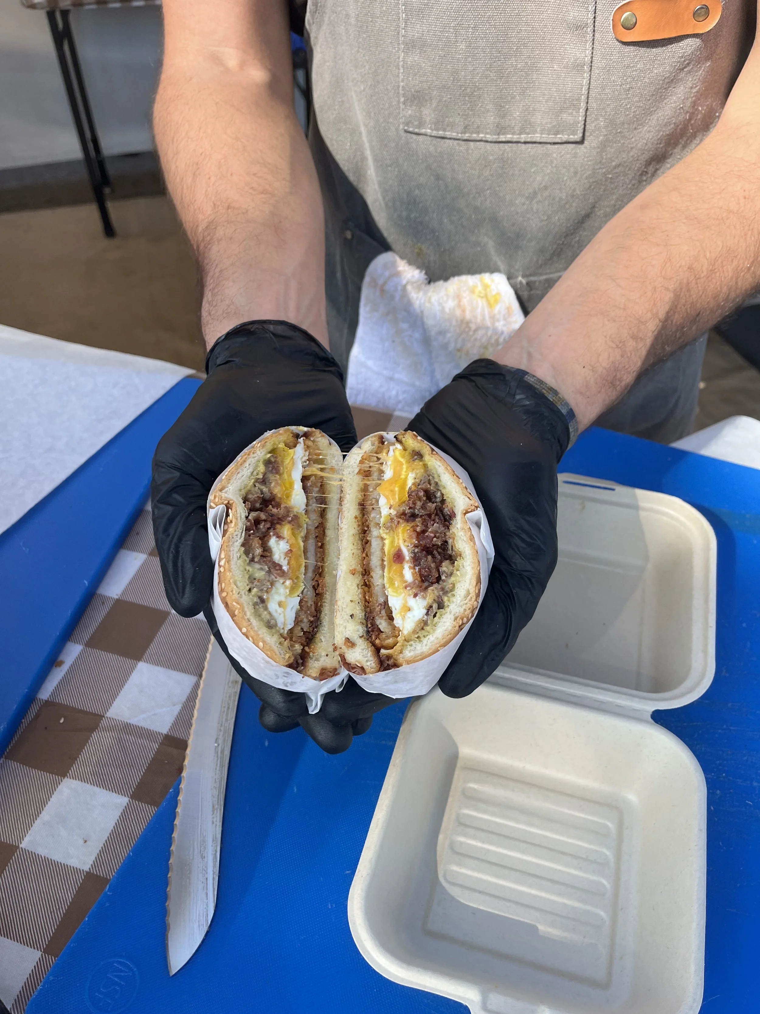 They say the East Coast Sandwich was born under flickering neon lights in the back of a no-nonsense New York bodega, where a breakfast wizard with a spatula in one hand and attitude in the other crafted a sandwich that could silence a taxi horn. He started with TWO EGGS cooked over medium, the yolks set just right—thick and golden, made to drip slow and smooth, never burst or run wild. Those perfect eggs were topped with a bubbling layer of melted CHEDDAR CHEESE then gently laid over a crispy HASH BROWN patty, stacked with the precision of a subway engineer. He toasted a SESAME KAISER ROLL until it had just the right bite—crisp outside, cloud-soft inside—then brought the whole tower together. But the magic? That came from a final shower of crispy BACON crumbles, smoky and bold, and a generous drizzle of his secret weapon: a GREEN SAUCE made of jalapeño and tomatillo, bright, zippy, and borderline addictive. They say he disappeared after perfecting it, leaving only the sandwich behind… and those lucky enough to taste it have been chasing the flavor ever since.