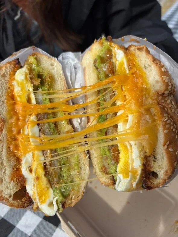 Out on the golden coast, where the air smells like surf wax and citrus, a different kind of sandwich took shape—one with soul as sunny as its yolks. The legend goes that a mellow coastal chef, part skater, part sandwich sage, crafted it while watching waves roll in just past sunrise. First, he grilled a SESAME KAISER ROLL to perfection—crispy with just enough give to cradle greatness. Then came the TWO EGGS over medium, cooked so masterfully that the yolks held strong with a gentle jiggle, breaking only when you wanted them to—not a mess, but a moment. He stacked them on top of a crispy HASH BROWN patty, letting the textures layer like tide on sand. Then came the CHEDDAR CHEESE, melty and sharp, followed by mashed AVOCADO, cool and creamy like an ocean breeze. Finally, a ribbon of CHIPOTLE AIOLI sealed the deal—smoky, tangy, with just enough kick to wake you up before your second bite. Those who eat it say it doesn’t just taste like California—it feels like it: bright, effortless, and kinda life-changing.